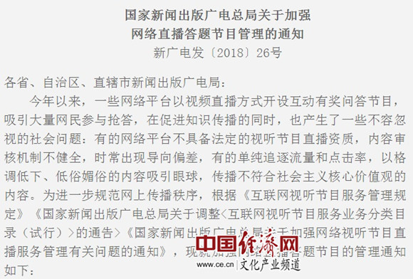 國家新聞出版廣電總局關(guān)于加強網(wǎng)絡(luò)直播答題節(jié)目管理的通知