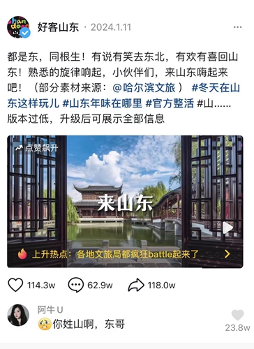 在一些平臺(tái)上,河南文旅答題送鉆石;張家界文旅局長(zhǎng)跳“科目三”;齊齊哈爾請(qǐng)了演員沈騰發(fā)布視頻,“邀請(qǐng)各地王子公主到齊齊哈爾”;河北文旅也和演員趙麗穎在網(wǎng)上互動(dòng),趙麗穎直呼“我為河北文旅扛大旗”;沈陽(yáng)的文旅局局長(zhǎng)還注冊(cè)了社交平臺(tái)賬號(hào),并迅速解決網(wǎng)友反映的旅游痛點(diǎn)……不僅如此,還有的地方文旅直接免景區(qū)門(mén)票,推出優(yōu)惠大禮包,“真金白銀”吸引客源。