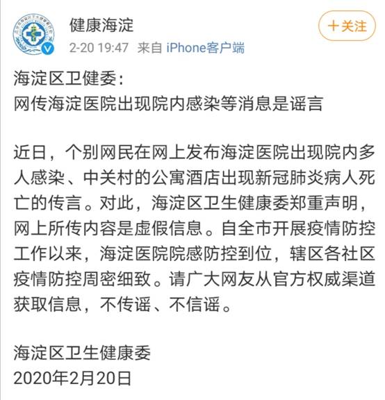 經(jīng)濟日報-中國經(jīng)濟網(wǎng)2月21日訊 (記者朱國旺 郭文培) 近日,個別網(wǎng)民在網(wǎng)上發(fā)布海淀醫(yī)院出現(xiàn)院內(nèi)多人感染、中關村的公寓酒店出現(xiàn)新冠肺炎病人死亡的傳言。