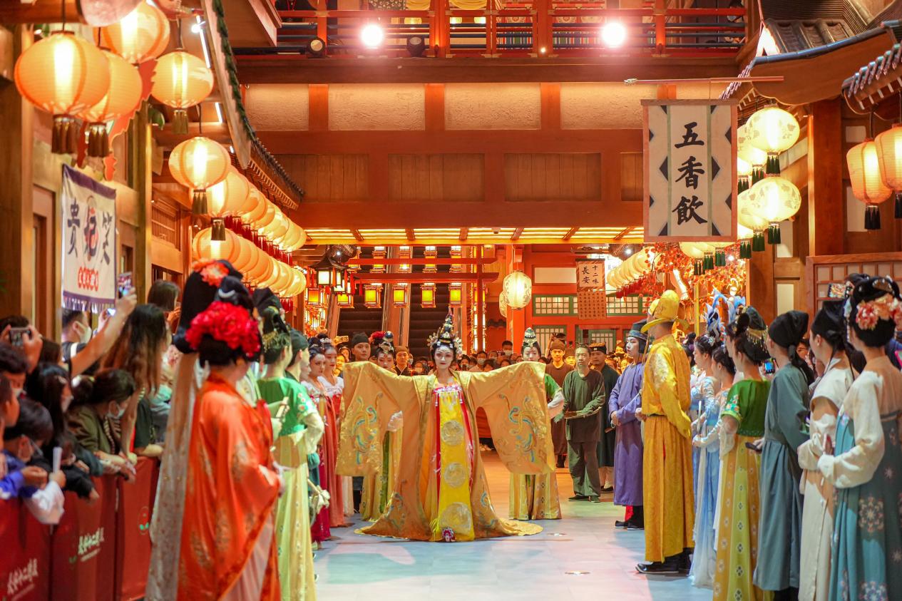 在西安,長安十二時辰主題街區(qū)已成為現(xiàn)象級文化IP。這個以唐文化為底色的唐風沉浸式主題樂園,不僅還原了唐長安城坊市繁華場景,更通過“影視IP+文化創(chuàng)意+全感官沉浸式體驗”模式,開業(yè)以來接待游客量突破700萬人次,新消費場景也以輻射效應帶動周邊餐飲、住宿、漢服產(chǎn)業(yè)增收?!拔覀儾皇呛唵螐椭铺莆幕?,而是用年輕人喜歡的方式重構(gòu)文化消費場景?!标兾魑穆每毓捎邢薰径麻L、長安十二時辰主題街區(qū)負責人鄒林豐介紹,街區(qū)將獨特的唐文化餐飲、漢服走秀、游戲沉浸式體驗與文化消費生態(tài)相融合,在激發(fā)游客文化歸屬感的同時,持續(xù)帶動街區(qū)二銷創(chuàng)收,2024年全年街區(qū)總收入達2.3億元。