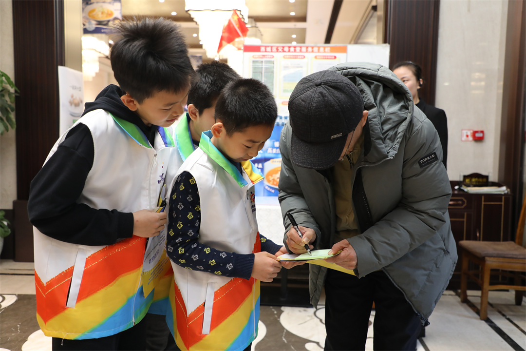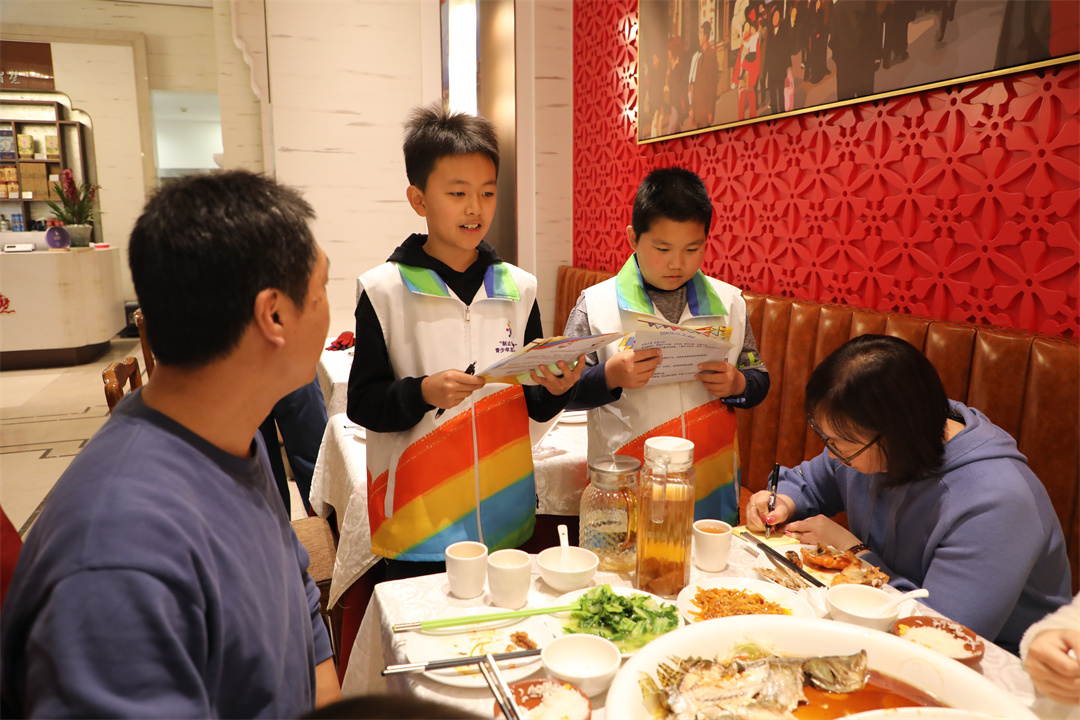 志愿者們還學(xué)以致用,化身“制止餐飲浪費宣傳員”,向餐廳中的食客宣傳節(jié)糧反浪費知識,發(fā)放節(jié)糧知識宣傳單,并邀請食客寫下自己節(jié)約糧食和避免浪費的心得。在店食客積極參與留言并對小志愿者的宣講表示認(rèn)同。