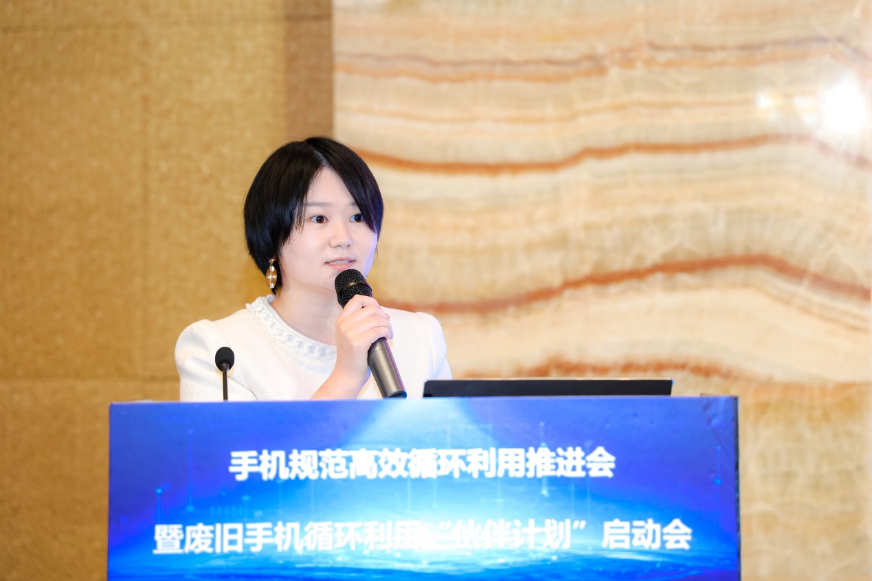 中國循環(huán)經(jīng)濟(jì)協(xié)會互聯(lián)網(wǎng)+資源循環(huán)利用專委會秘書長侯允在會上發(fā)布廢舊手機(jī)循環(huán)利用團(tuán)體標(biāo)準(zhǔn)框架。(主辦方供圖)