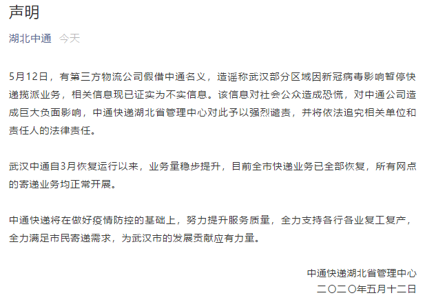 5月12日,湖北中通吉物流有限公司官微“湖北中通”發(fā)布聲明稱,5月12日,有第三方物流公司假借中通名義,造謠稱武漢部分區(qū)域因新冠病毒影響暫??爝f攬派業(yè)務,相關(guān)信息現(xiàn)已證實為不實信息。武漢中通自3月恢復運行以來,業(yè)務量穩(wěn)步提升,目前全市快遞業(yè)務已全部恢復,所有網(wǎng)點的寄遞業(yè)務均正常開展。