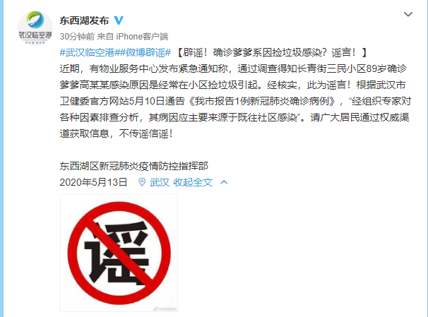 據(jù)武漢市東西湖區(qū)人民政府官方微博5月13日消息,近期,有物業(yè)服務中心發(fā)布緊急通知稱,通過調(diào)查得知武漢市東西湖區(qū)長青街三民小區(qū)89歲確診爹爹高某某感染原因是經(jīng)常在小區(qū)撿垃圾引起。經(jīng)核實,此為謠言。根據(jù)武漢市衛(wèi)健委官方網(wǎng)站5月10日通告《我市報告1例新冠肺炎確診病例》,“經(jīng)組織專家對各種因素排查分析,其病因應主要來源于既往社區(qū)感染”。請廣大居民通過權(quán)威渠道獲取信息,不傳謠信謠!