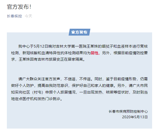 近日,有網(wǎng)傳稱吉林大學第一醫(yī)院出現(xiàn)新冠病例。5月13日,長春市疾病預防控制中心官微對此回應稱,長春市疾病預防控制中心于5月12日晚對吉林大學第一醫(yī)院王某姝的咽拭子和血液樣本進行復核檢測,新冠核酸和血清特異性抗體檢測結(jié)果均為陰性。另外,根據(jù)目前疫情防控要求,王某姝因有吉林市旅居史正在居家隔離。請廣大群眾關(guān)注官方發(fā)聲,不信謠,不傳謠。