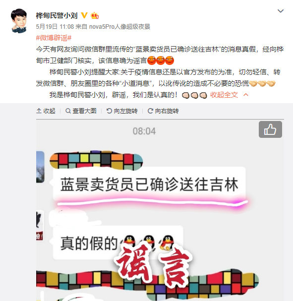 據(jù)吉林省樺甸市公安局永吉派出所民警劉剛 @樺甸民警小劉 5月19日消息,經(jīng)向樺甸市衛(wèi)健部門核實,網(wǎng)傳“藍(lán)景賣貨員已確診送往吉林”系謠言。