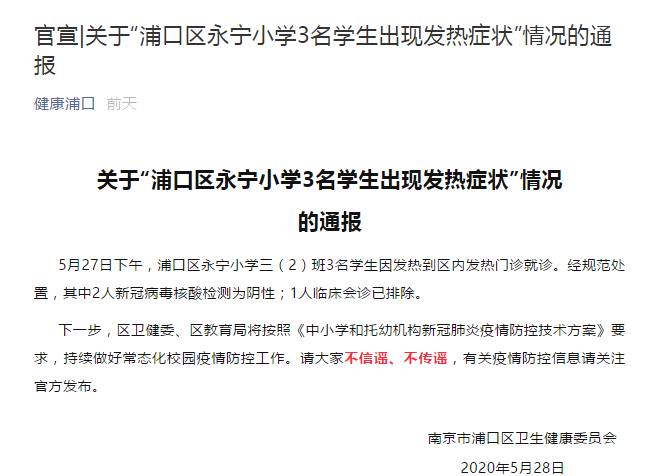 針對網絡傳言“南京浦口永寧小學發(fā)生聚集性疫情,導致全班停課?!?月28日, 南京市浦口區(qū)衛(wèi)生健康委員會官微“健康浦口”發(fā)布《關于“浦口區(qū)永寧小學3名學生出現(xiàn)發(fā)熱癥狀”情況》澄清事實。