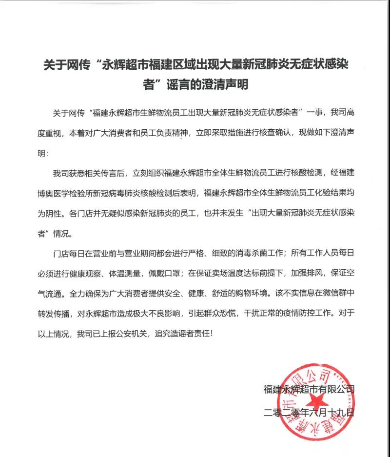 經(jīng)濟日報-中國經(jīng)濟網(wǎng)6月23日訊(記者朱國旺 郭文培) 6月19日,就“福建永輝超市生鮮物流員工出現(xiàn)大量新冠肺炎無癥狀感染者”一事,福建永輝超市有限公司聲明稱,獲悉相關(guān)傳言后,立刻組織福建永輝超市全體生鮮物流員工進行核酸檢測,福建永輝超市全體生鮮物流員工化驗結(jié)果均為陰性。各門店并無疑似感染新冠肺炎的員工,也并未發(fā)生“出現(xiàn)大量新冠肺炎無癥狀感染者”情況。