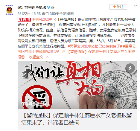 6月22日,保定市公安局網(wǎng)絡(luò)安全保衛(wèi)支隊發(fā)布警情通報稱,網(wǎng)傳“河北省保定市順平縣一帶魚老板店去北京新發(fā)地進魚被隔離”等信息為謠言。經(jīng)過市縣兩級網(wǎng)安部門調(diào)查,造謠人翟某某已被順平公安機關(guān)依法行政拘留。