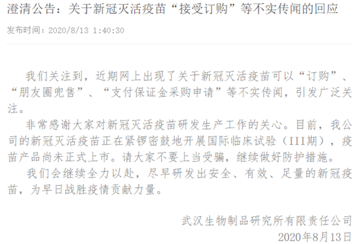 經(jīng)濟(jì)日?qǐng)?bào)-中國(guó)經(jīng)濟(jì)網(wǎng)8月13日訊(記者朱國(guó)旺 郭文培)近期,網(wǎng)上出現(xiàn)了關(guān)于新冠滅活疫苗可以“訂購(gòu)”、“朋友圈兜售”、“支付保證金采購(gòu)申請(qǐng)”等不實(shí)傳聞,引發(fā)廣泛關(guān)注。8月13日,武漢生物制品研究所有限責(zé)任公司對(duì)此澄清:“目前,我公司的新冠滅活疫苗正在緊鑼密鼓地開展國(guó)際臨床試驗(yàn)(III期),疫苗產(chǎn)品尚未正式上市。請(qǐng)大家不要上當(dāng)受騙,繼續(xù)做好防護(hù)措施。”