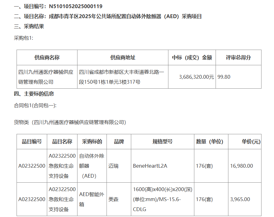 公告顯示,四川九州通醫(yī)療器械供應鏈管理有限公司以99.80的評審總得分中標,中標(成交)金額為3686320.00元,將供應176(套)邁瑞公司的自動體外除顫器(AED),單價為16980.00元;供應176(套)美森公司的AED智能外箱,單價為3965.00元。