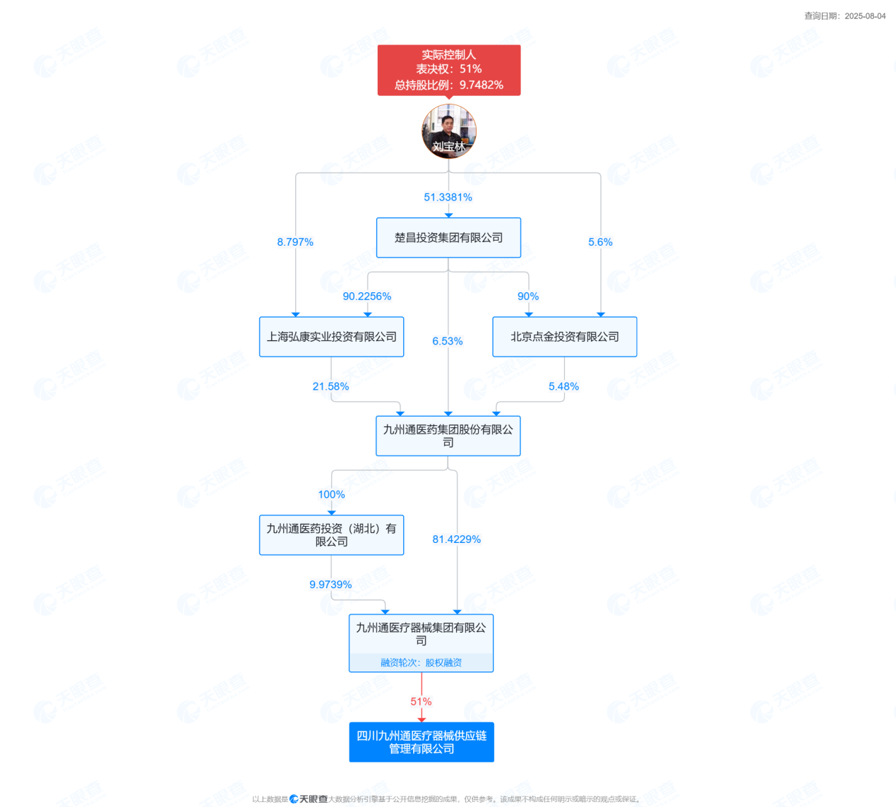 天眼查顯示,四川九州通醫(yī)療器械供應鏈管理有限公司成立于2023年,注冊資本6000萬元,是九州通醫(yī)藥集團股份有限公司孫公司,也系楚昌投資集團成員。