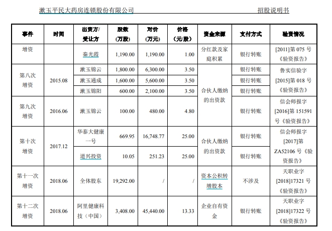 “V觀財(cái)報(bào)”查閱漱玉平民招股書發(fā)現(xiàn),2018年6月,漱玉平民股東大會(huì)通過決議,同意將注冊(cè)資本增加至36480萬元。新增的注冊(cè)資本3408萬元由阿里健康以45440萬元認(rèn)繳,全部為貨幣出資。本次增資的價(jià)格為13.33元/股。