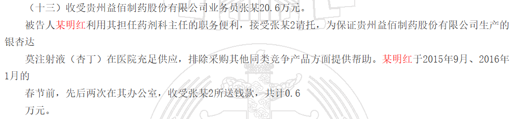 記者檢索中國(guó)裁判文書網(wǎng)發(fā)現(xiàn),此摘錄文章源自《某明紅受賄一審刑事判決書》。此判決書顯示,貴州益佰制藥股份有限公司業(yè)務(wù)員涉其中。