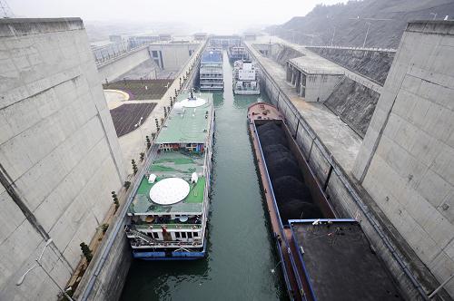 2008年2月23日,船舶在三峽船閘閘室內(nèi)等待過(guò)閘。2009年6月17日,三峽船閘安全穩(wěn)定通航6年,發(fā)揮了巨大的通航效益。截至6月底,三峽船閘累計(jì)運(yùn)行近5萬(wàn)閘次,過(guò)閘貨運(yùn)量突破3億噸。新華社記者杜華舉攝